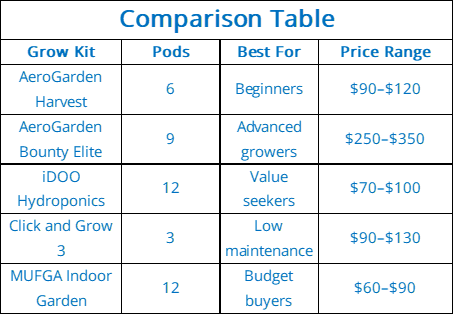 Indoor grow kits are a great way to grow fresh herbs and greens at home with minimal effort. If you want simplicity and reliability, AeroGarden is hard to beat. For budget‑friendly options, iDOO and MUFGA provide excellent value. If design and ease matter most, Click and Grow is worth considering.